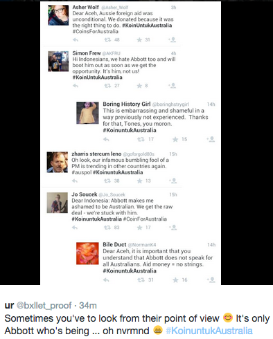 Halo Indonesia, kita menyumbang karena memang benar-benar ingin menyumbang. Sumbangan itu berasal dari pajak Australia bukan dari Abbot. Saya benci Abbot, dia memalukan saya dan warga Australia. Begitulah intinya pernyataan tweeps dukungan dari warga Australia.