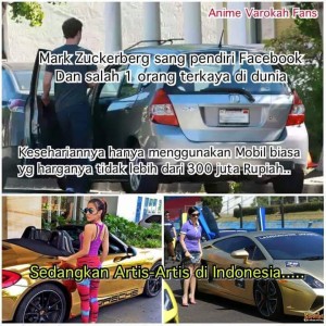 Netizen Bandingkan Zuckerberg dengan Mewahnya Artis Indonesia. Seperti diketahui sebelumnya Zuckerberg selalu mengenakan kaos oblong favoritnya dalam kesehariannya, mobil yang sederhana pun dipakainya yakni mobil Honda Fit (Jazz) dengan harga sekitar Rp 300 juta.