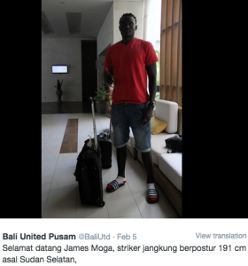 Dilansir dari akun twitter Bali United, Juma’t kemarin (7/2) kedatangan calon pemain asing untuk mengisi skuad Bali United untuk mengarungi kompetisi Liga Super Indonesia (ISL) 2015. Dia adalah James Moga. Pemain jangkung berposisi stiker ini merupakan pemain timnas Sudan Selatan yang terakhir bermain di Liga India. Mari kita telusuri profilnya.